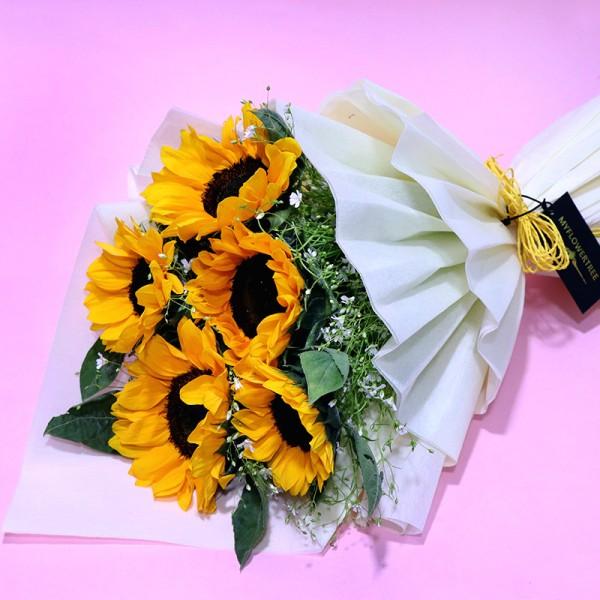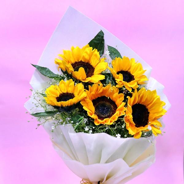 Express admiration with this bunch of 5 radiant yellow sunflowers, beautifully wrapped in paper packing. A cheerful token of affection, this bouquet is ideal for friendship day, birthdays, housewarmings, congratulatory moments, or simply to brighten someone’s day.