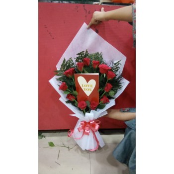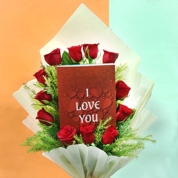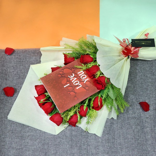 Present the stunning 12 red rose bouquet with love you card to impress partners. No other combo than this workout so well to confess your heart.