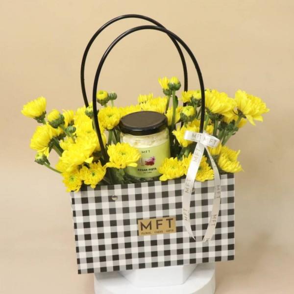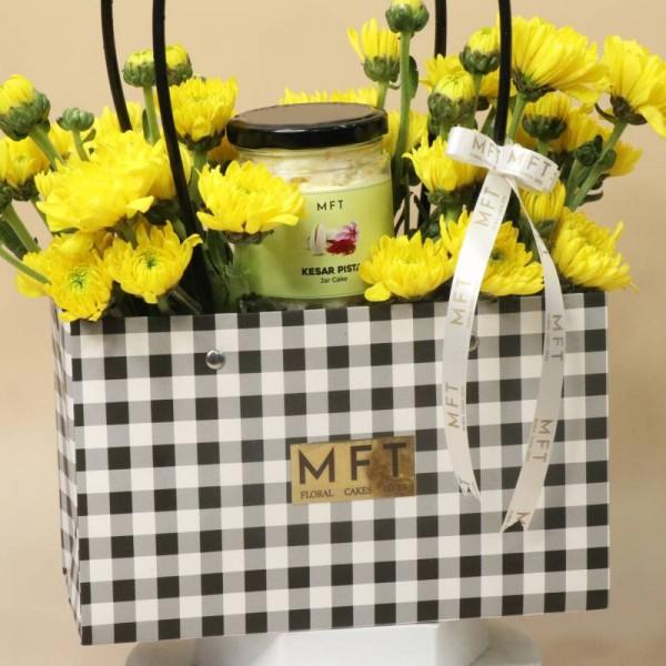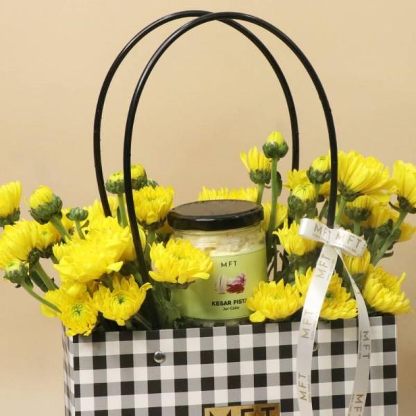 Brighten someone's day with our Sweet Bloom Bag, a premium gift set that combines the natural beauty of fresh Daisy flowers with the irresistible taste of a handcrafted Kesar Pista Vanilla jar cake. Thoughtfully packed in an elegant gift bag, this combo is perfect for birthdays, anniversaries, thank-you gifts, or just because.The cheerful daisies add a touch of freshness and positivity, while the rich, layered jar cake satisfies every sweet craving. It’s a heartwarming way to say “you matter” with both blooms and bites.