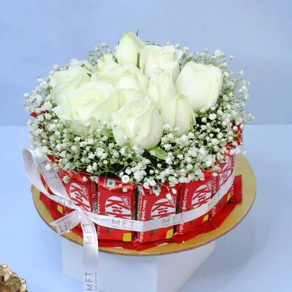 Indulge in the rich charm of our Gourmet Delights Chocolate Basket – a luxurious fusion of artisanal chocolates and elegant blooms. Featuring a stunning floral arrangement of 10 white roses and gypso, paired with 15 KitKat chocolates (13.2 gm each), this hamper is the perfect gift for any celebration. Whether shared or savored solo, it's a true treat for the senses.