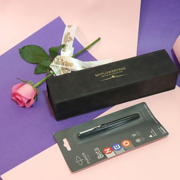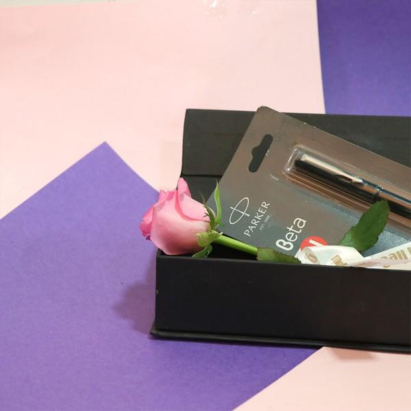 Here is the box of joy and excitement that holds an incredible parker pen and a single rose. Something heart-touching and hand-touching will deliberate your meaningful efforts.
