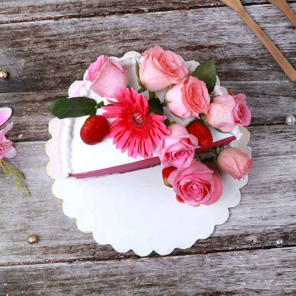 We baked a delicious cake for you which is one of its own kind. Presenting you this delicious half cake garnished with fresh flowers and some luscious strawberries on the top. This one cake is ideal for six months birthday or anniversary celebration.
