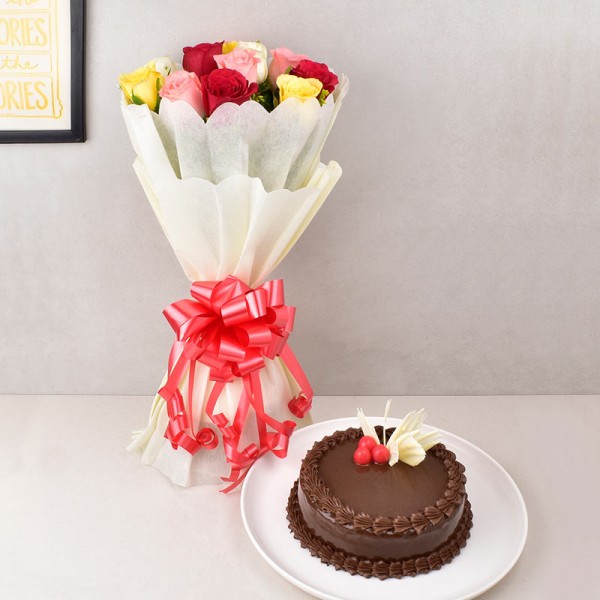 Let love bloom with this vibrant mix of red, yellow, white, and pink roses, beautifully arranged to light up any space with warmth and affection. Paired with a delicious chocolate cake, this combo is perfect for expressing your love on birthdays, anniversaries, Valentine’s Day, or just to make someone feel truly special.Order now from MyFlowerTree and share happiness in the sweetest way!
