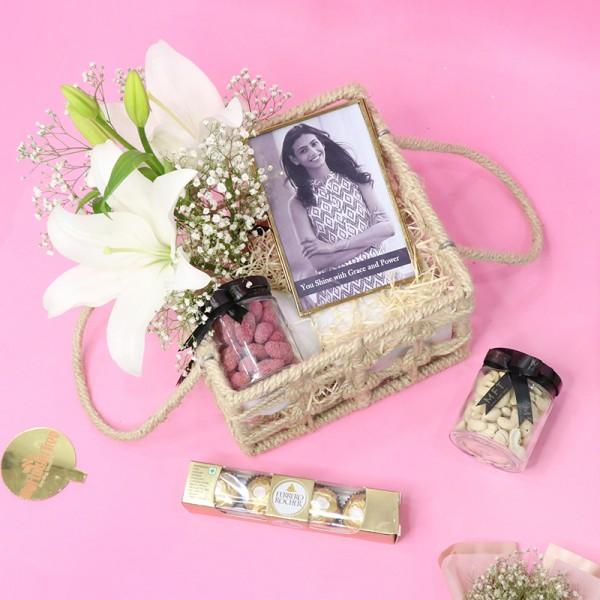 Celebrate Women’s Day with a vibrant and thoughtfulhamper that’s designed to inspire and delight. Thisbeautifully curated gift set includes a bright sunflower tobring cheer, a delicious gourmet chocolate cake jar for asweet treat. Unwind with an aromatic bubblecandle and stay organized with a stylish plannernotebook. All of these items are carefully packed in areusable hamper tray, making it a perfect gift for theincredible women in your life