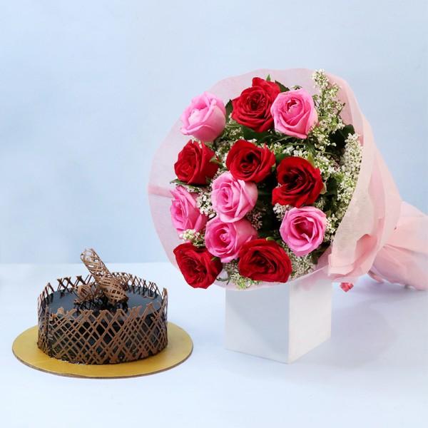 Red and Pink are the timeless shades of love and affection. This stunning bouquet of 10 Red and Pink Roses, elegantly wrapped in pink paper, paired with a delicious Half Kg Chocolate Truffle Cake, makes the perfect surprise for your loved ones. Ideal for Birthdays, Anniversaries, Valentine’s Day, Women’s Day, or any celebration of love.