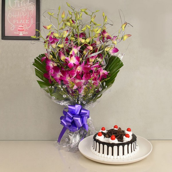 When words can't express your love and thankfulness, send this lovely combo of 8 purple orchids bunch and a blackforest cake. It would be the right way of proving your feelings and high regards towards special someone.