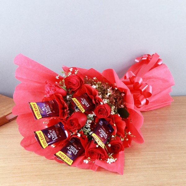 Let your special someone unwind in a paradise of charming red roses and sinful chocolates with this delightful gift combo. Featuring a bouquet of 6 fresh red roses paired with 5 creamy Dairy Milk chocolates, this thoughtful gift is perfect for deepening your bond and expressing your heartfelt emotions.Ideal for anniversaries, birthdays, or any moment worth celebrating, this combo from MyFlowerTree makes love and sweetness inseparable.