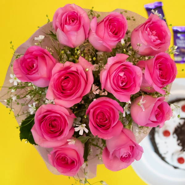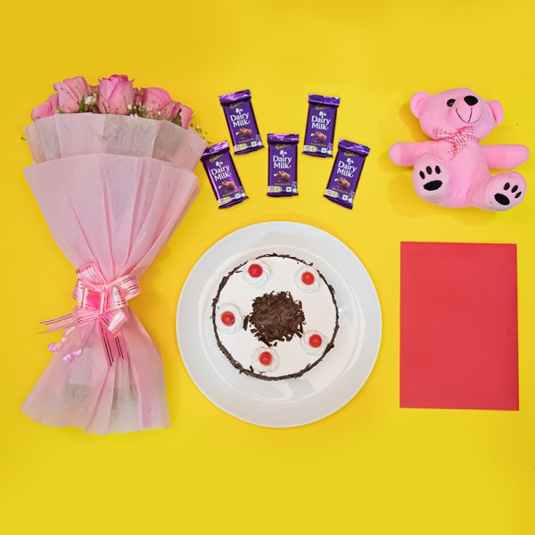 Send this Romantic combo that includes a Dozen of Pink Roses, arranged in a bunch and a Half kg Black Forest Cake. Not just this, it includes a Teddy Bear, a Greeting Card and 5 DairyMilk Chocolates too.