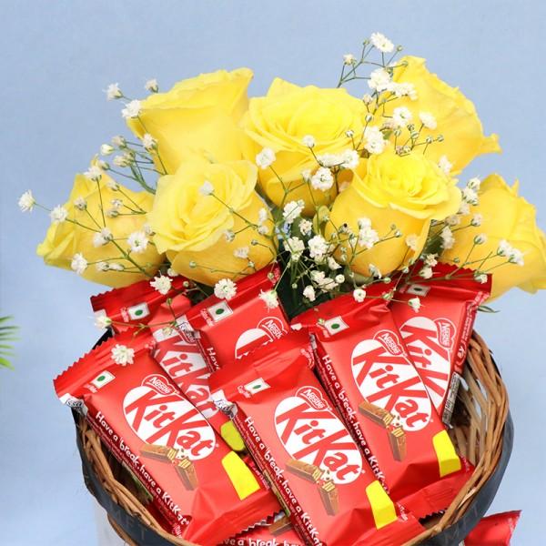 Looking for the perfect gift to spread joy and positivity? The Yellow Roses and KitKat Chocolate Combo is a vibrant and heartwarming choice that suits every occasion. Featuring a beautiful basket arrangement of 7 fresh yellow roses paired with 7 crispy KitKat chocolates, this thoughtful gift delivers both beauty and indulgence in one delightful package.