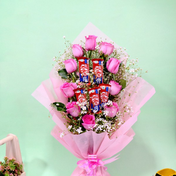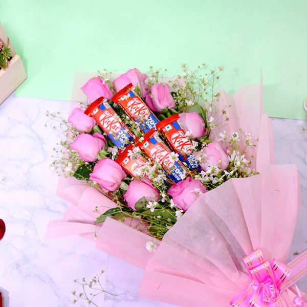 Pink rose bouquet is so appealing to the eyes and the pastel pink roses symbolizing gratitude and admiration clubbed with sweet scrumptious chocolates are a gift that is handcrafted by us with love for your love.
