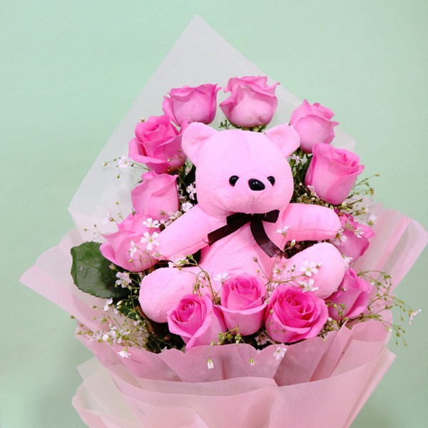 A bouquet of a coral pink teddy bear surrounded by garden-fresh pink roses perfectly wrapped in baby pink attire is a sight to behold, with all of the lovely elements crafted with love solely for love.