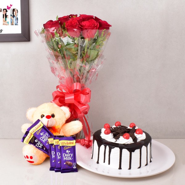 Just to give you a perfect Gift Hamper, we curated this one. It has 12 Red Roses, 5 Cadbury's DairyMilk Chocolates, Half Kg goodness of Black Forest Cake and a sweet 6 inches tall Teddy Bear. Everything that a perfect gift requires is right here!