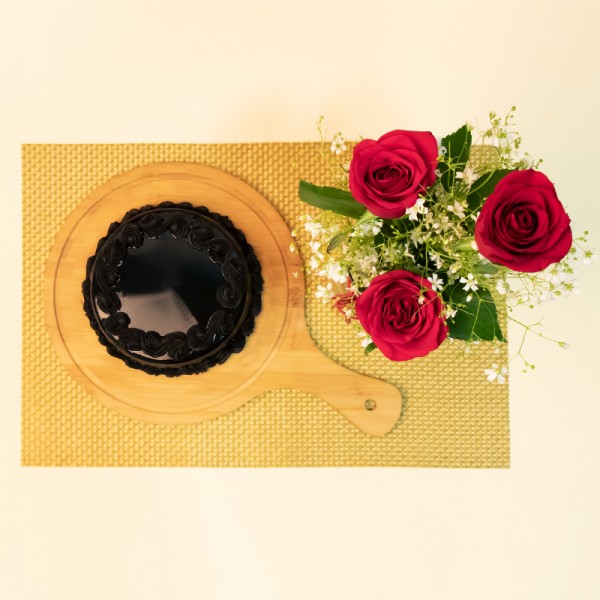 It goes by the name, so simple but does magic every time it greets someone. Send an arrangement of 3 Red Roses gracefully placed in a Glass Vase and a Half Kg Dark Chocolate Cake to someone special.