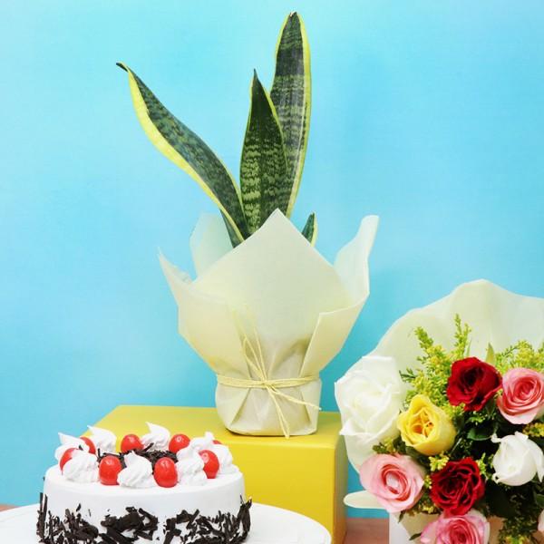 Product Contains : - Snake Plant Wrapped with Tissue Paper in Plastic Pot - Half Kg Black Forest Cream Cake - 10 Mixed Roses Bouquet