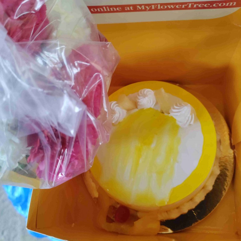 This is the most tempting gift that you just cannot resist. This freshly baked half kg pineapple cake, adorned with beautiful design and bouquet of 10 mixed carnations is the most suitable gift for bringing happiness. You can send this wonderful surprise to anyone you want by placing an order here easily. The deliciousness of cake with flowers like carnations is the most wonderful combo of gift. So go for it!