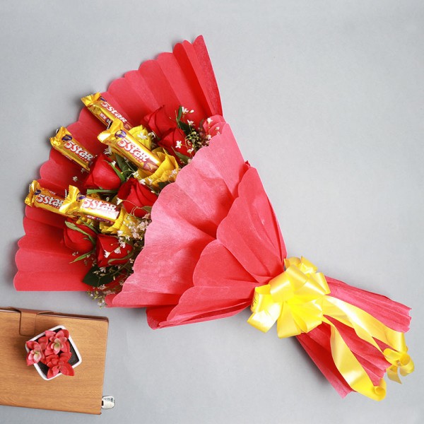 - One Bouquet of 6 Red Roses and 5 Five Star (19.5 gm) Chocolates