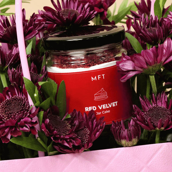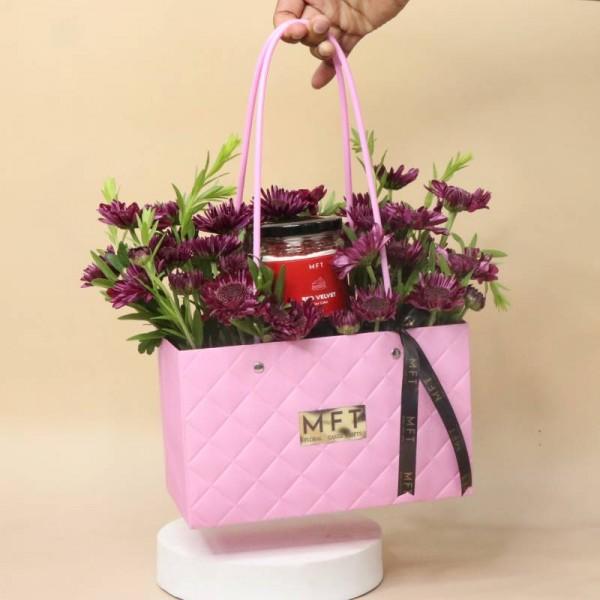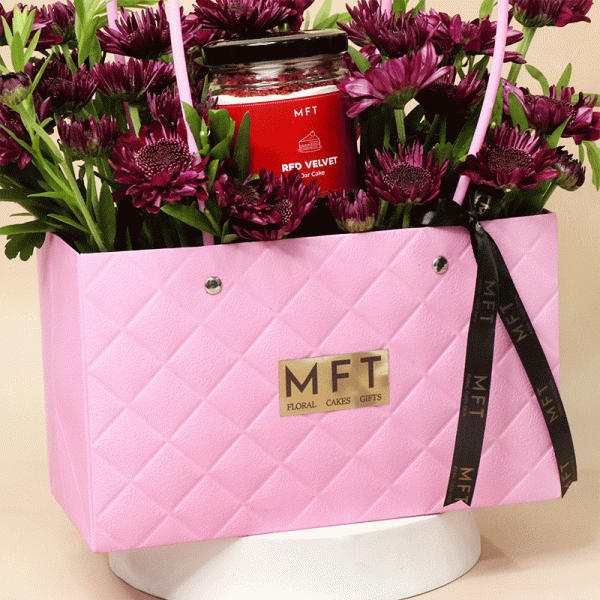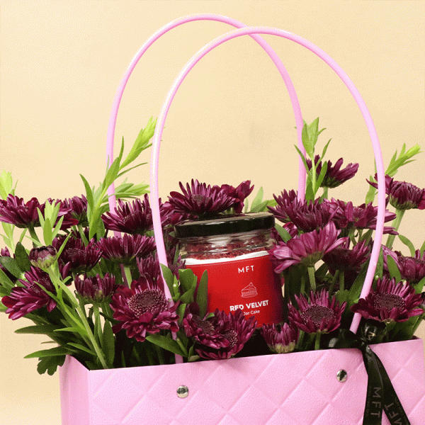 Indulge in elegance with Velvet Bloom, a luxurious pairing of deep charm and sweet delight. This exquisite gift set features a premium handbag arrangement of enchanting purple daisies, symbolizing grace, admiration, and creativity — perfectly complemented by a rich and indulgent Red Velvet Jar Cake, crafted to satisfy the senses.