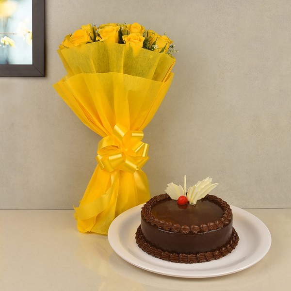 This gift bunch of 12 yellow roses wrapped beautifully in a yellow paper is a sign of everlasting friendship for your lover/ relatives/ friends. This magnificently arranged bunch of yellow coloured blossoms and a chocolate cake along, will make your friends and relatives happy.